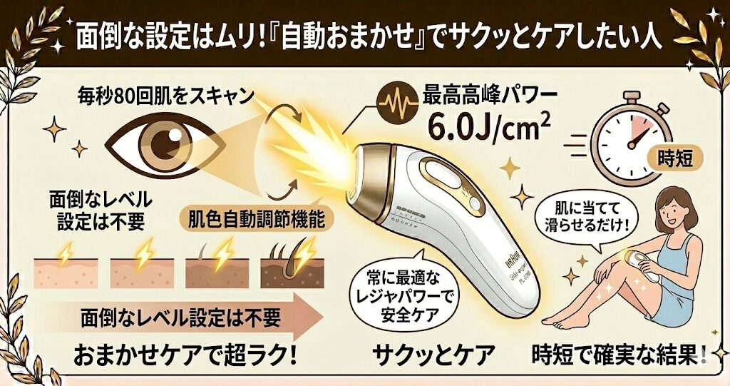 肌の色に合わせて自動でパワーを調節してくれるので、自分で細かく設定する手間がありません。