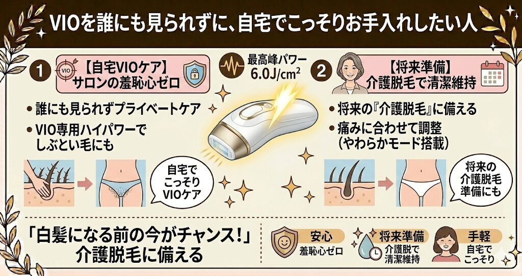 「サロンでVIOをさらけ出すのは絶対にムリ!」という方にとって、自宅でこっそり、しかもサロン級のハイパワーでケアできるのは本当に心強いポイントです。