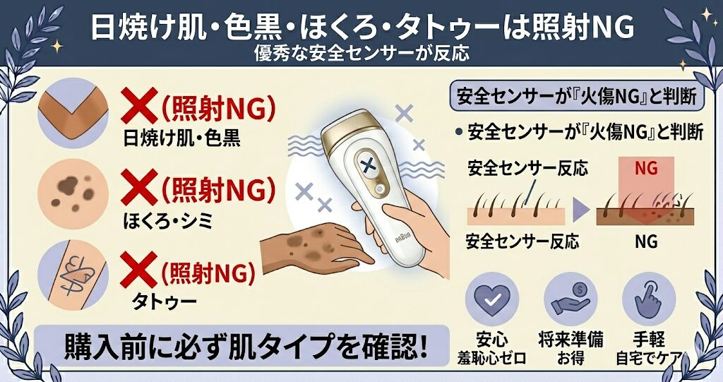 肌の色が極端に濃い部分(日焼け直後など)や、ほくろ、タトゥーがある部分には、センサーが「火傷の危険あり」と判断してフラッシュが照射されません。
