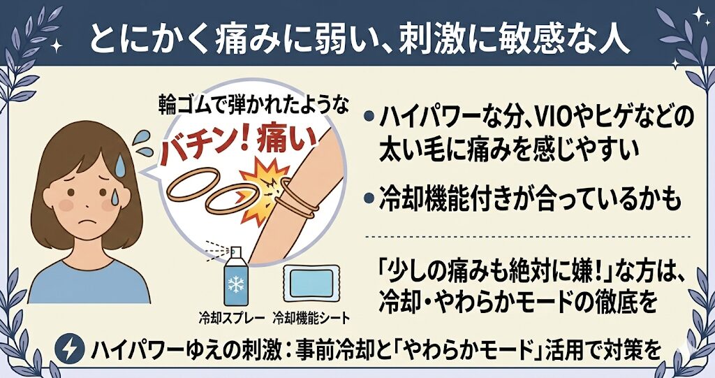 パワーは落ちますが、最初から冷却機能がついている低刺激タイプの脱毛器の方が合っているかもしれません。