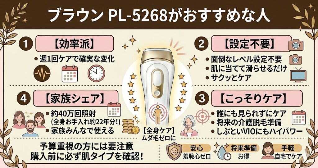 良い口コミやメリットを踏まえると、PL-5268は以下のような方に自信を持っておすすめできる脱毛器です。