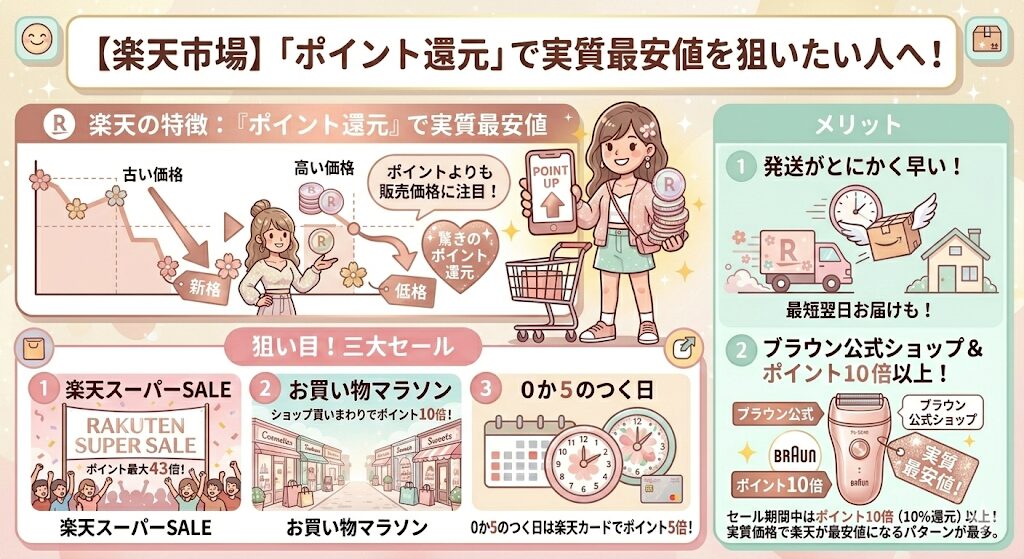 メリット: セール期間中は「ポイント10倍(10%還元)」以上になることが多く、実質価格では楽天が最安値になるパターンが最も多いです。