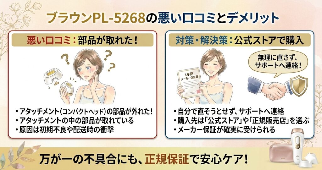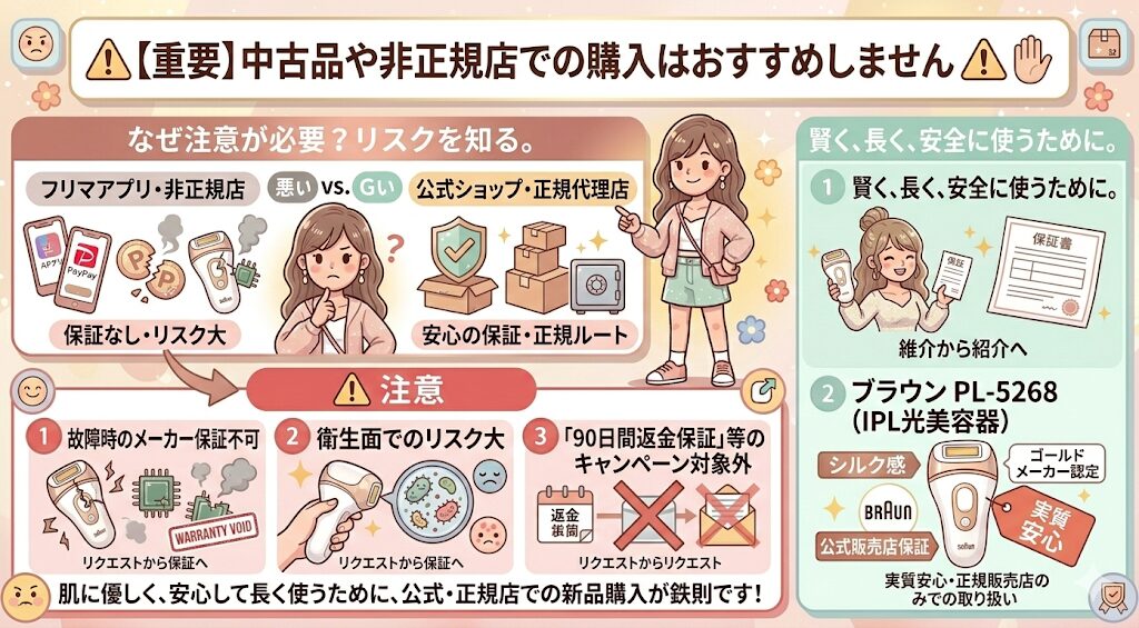 たまにブラウン PL-5268フリマアプリや格安の非正規ショップで見かけることがありますが、高価な美容家電だからこそ、保証のある「公式ショップ」または「正規代理店」での購入を強くおすすめします。
