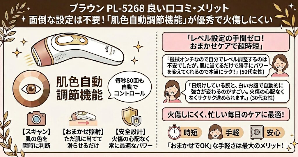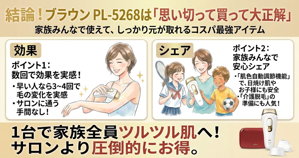 ブラウン PL-5268は、初期費用がかかっても、「確かな効果」と「肌色自動調節の安全性」にお金を払える人向けの製品です。