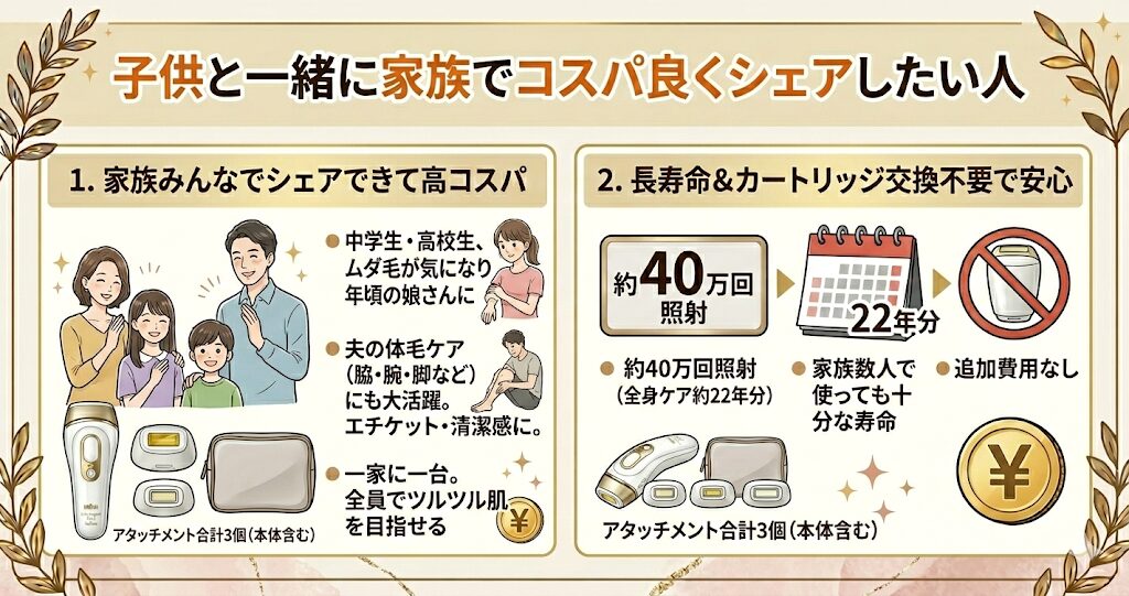 コスパ最強: 約40万回照射(一人全身ケア約22年分)で、家族でシェアしても十分な寿命。