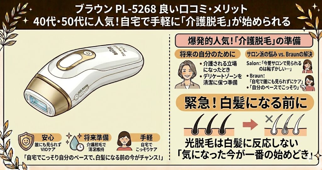 最近、40代・50代の女性に爆発的に売れている理由が「介護脱毛」の準備です。将来、自分が介護される立場になったときのためにデリケートゾーンを清潔にしておきたい、と考える方が増えています。